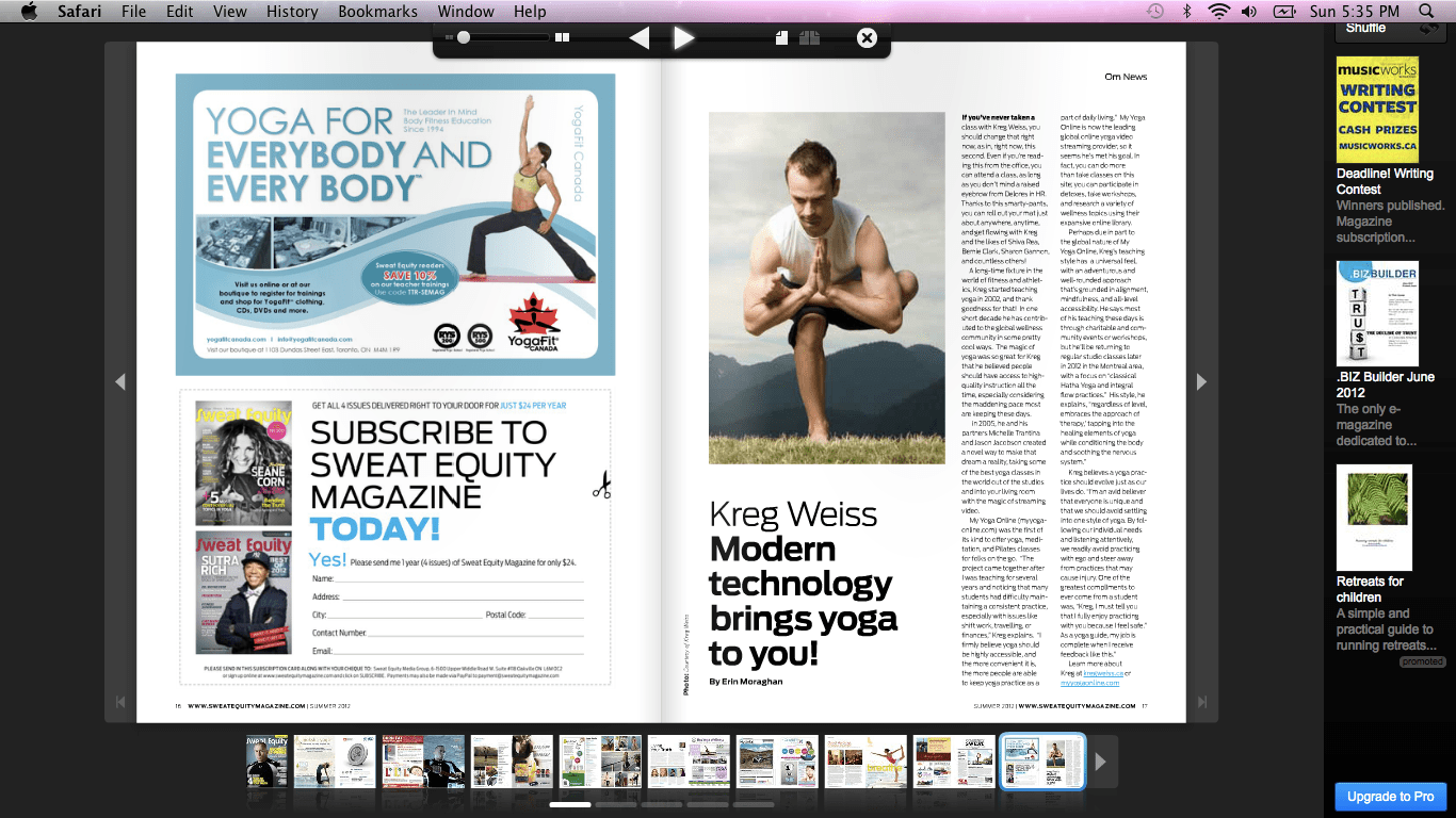 I am excited to have been featured in the Summer 2012 edition of Sweat Equity Magazine. Erin Moraghan did a great (and flattering) article about my journey as a teacher and as a co-founder of My Yoga Online.